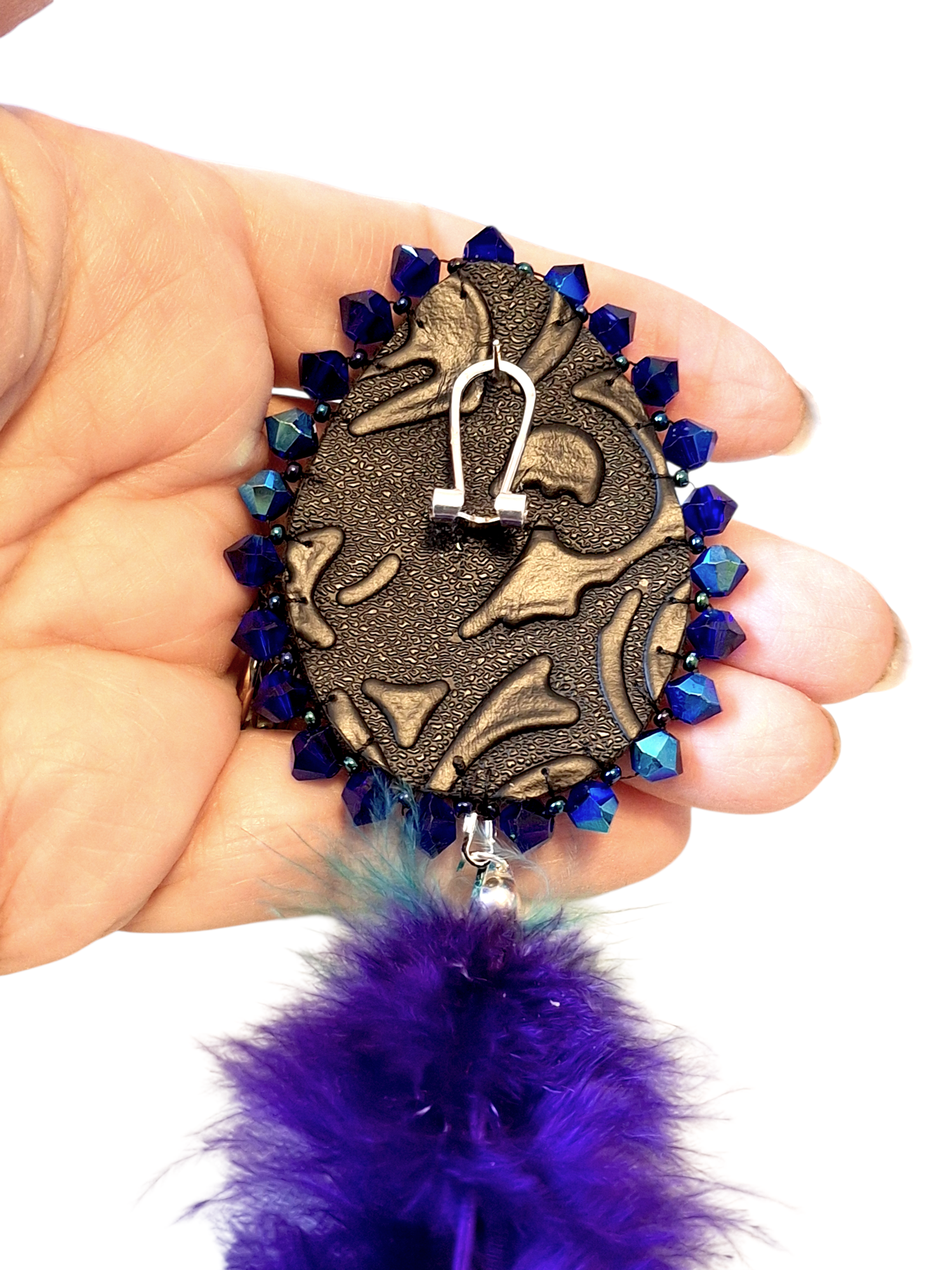 The central cabochon is made of acrylic and faceted to catch the light. The pattern is that of a peacocks' tail with many "eyes" in shades of dark blue and pale green. I have used Pale Aqua green Delica seed beads, Rainbow Mauve Delica seed beads and Blue Iris size 11 Czech seed beads to form a bezel that shimmers and shines. The edging is cobalt blue AB 4mm faceted crystals and I have backed the earrings with black embossed faux leather. The feathers are purple and turquoise blue dyed chicken feathers.